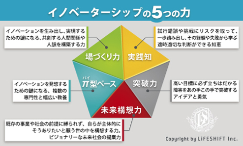 その習得には通常の業務を超えた経験や学習が必要であり、5つの力である「未来構想力」「実践知」「突破力」「パイ型ベース」「場づくり力」の各要素を意図的に伸ばしていくことによってはじめてイノベーターを育成していくことができます。